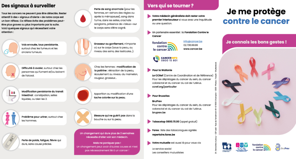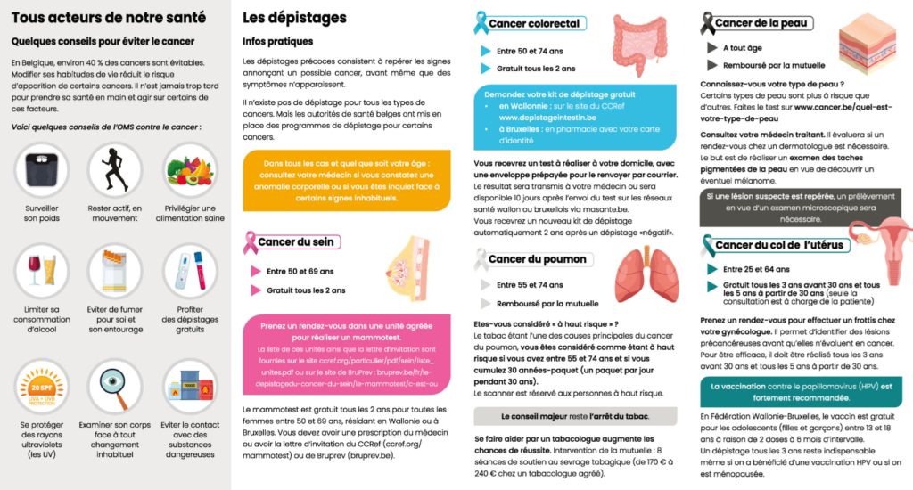 Ce flyer a été créé en 2023, à l’initiative de 3 acteurs (la Fondation contre le Cancer, les CCR et la MC). Le but de cet outil est d’encourager la pratique de dépistages des principaux cancers répertoriés en Belgique.